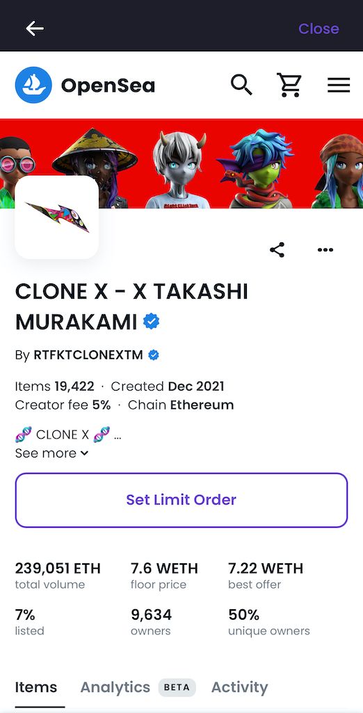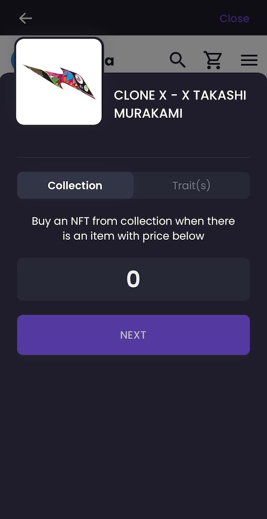 Place automated buy orders for a collection, combination of traits, or singular NFT. Let's use the CLONE X - X TAKASHI MURAKAMI collection as an example.
